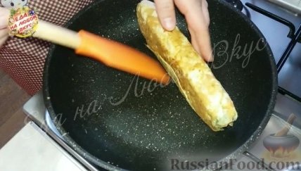 2 На разогретую, смазанную растительным маслом сковороду, выливаем половник яичной смеси. Как сверху схватится, сворачиваем в ролл, но не до конца.