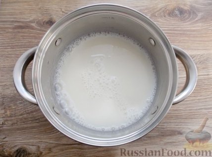 3 Нагрейте молоко и тонкой струйкой, помешивая, влейте в кастрюлю с агаром. Доведите до кипения, снимите с огня и дайте немного остыть.