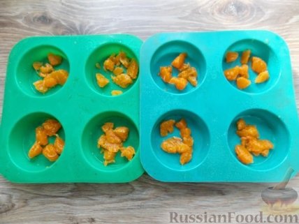 5 Разложите кусочки мандаринов по силиконовым формочкам.