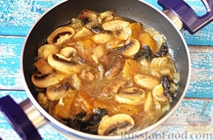 6 Затем добавим тыкву, шампиньоны и бульон (или воду). Подсолим.