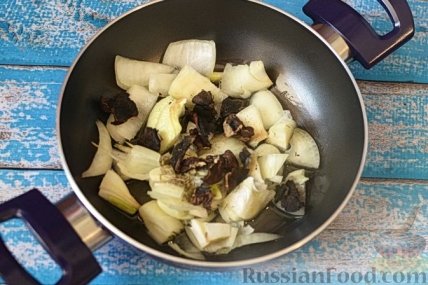 4 В кастрюле с толстым дном разогреем 30-40 мл оливкового масла и обжарим лук с чесноком 2-3 минуты (немного масла оставим для жарки пластинок шампиньонов для украшения).