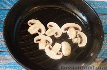 10 Разогреем в сковороде оставшееся оливковое масло и обжарим пластинки грибочков несколько минут, до подрумянивания.