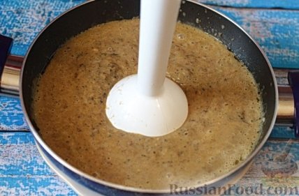 9 Пюрируем содержимое кастрюли с помощью погружного блендера до однородности. Поставим кастрюлю на огонь, доведем до кипения и выключим нагрев.