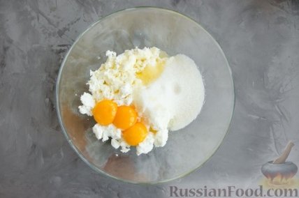 2 Поскольку все приготовления займут 15 минут, сразу включите духовку, чтобы она нагрелась до 170 градусов. Для самой запеканки в миску выложите творог, добавьте к нему растопленное сливочное масло, сахар, яичные желтки, ванильный сахар и щепотку соли.