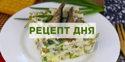 Рецепт дня: Шпротный салат с рисом, огурцом, горошком и яйцами