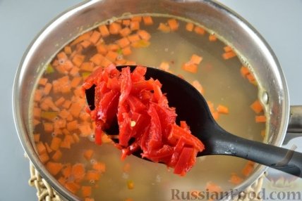 7 Болгарский перец нарезать соломкой или брусочками (я использовала уже нарезанный и замороженный перец) и добавить в кастрюлю. Варить на умеренном огне 5 минут.
