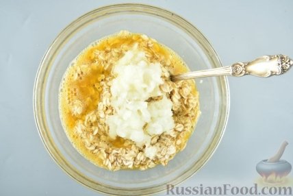 5 В миску с овсянкой добавить натёртый лук и яичную массу.