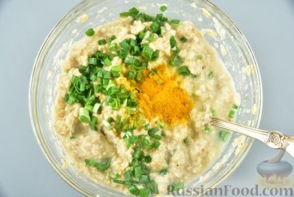 8 Добавить в миску измельчённый зелёный лук и куркуму.