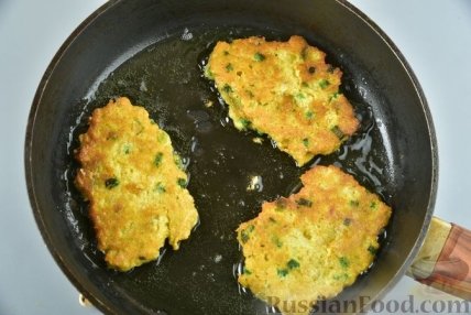 11 Жарить оладьи на среднем огне примерно по 2-3 минуты с каждой стороны, до румяности. По желанию обжаренные оладьи можно выложить на бумажную салфетку, чтобы впиталось лишнее масло.
