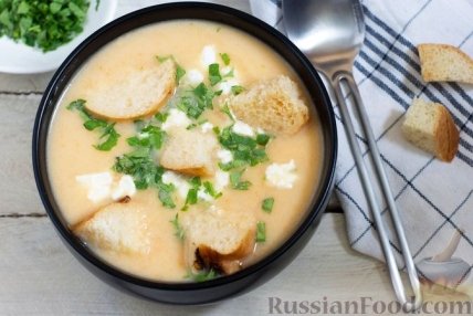 Отменный крем-суп из картофеля, моркови, лука и корневого сельдерея замечательным образом дополнен раскрошенным сыром фета!