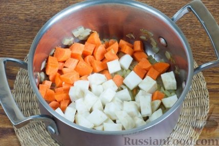 2 Очищенные морковь и сельдерей нарежьте средними кубиками и добавьте в кастрюлю.