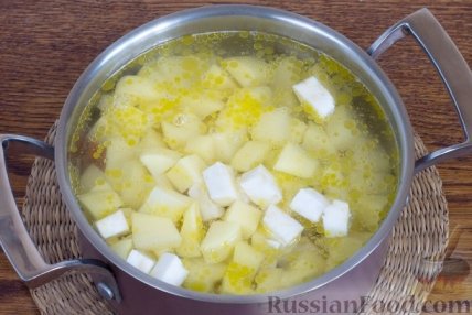 5 После закипания варите на маленьком огне 20-25 минут до готовности картофеля. Добавьте соль и черный молотый перец.