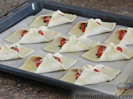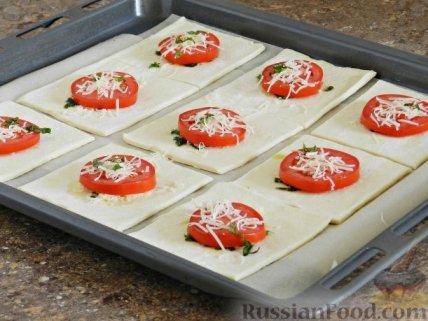11 Выпекать слоеные мини-пиццы с помидорами в нагретой до 200 градусов духовке в течение 15-20 минут.
