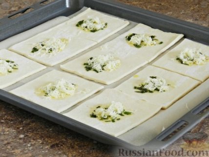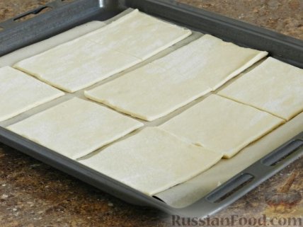 4 Слоеное тесто разморозить. Затем нарезать на квадраты и выложить на застеленный пергаментом противень.