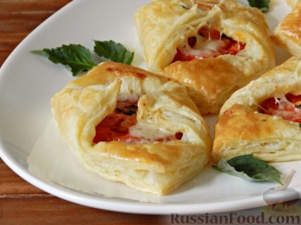 Мини-пиццы из хрустящего слоеного теста с начинкой из сочных помидоров и двух видов сыра. Слоеные мини-пиццы получаются очень ароматными благодаря добавлению базилика в оливковое масло, которым смазывают основу пиццы.