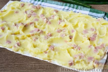 8 На лист лаваша выложите тёплое картофельное пюре с колбасой.