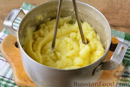 3 Приготовьте картофельное пюре, размяв картофель с маслом и молоком с помощью толкушки.