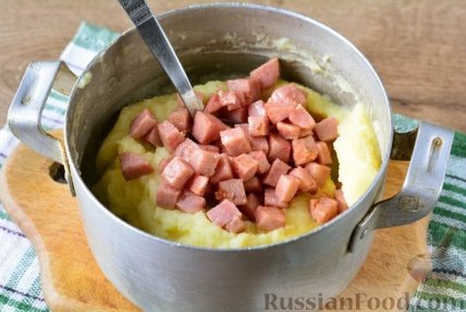6 Добавьте обжаренную колбасу в кастрюлю с пюре.