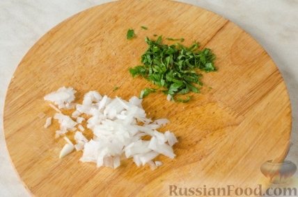 4 Лук очищаем и нарезаем кубиками. Измельчаем петрушку.
