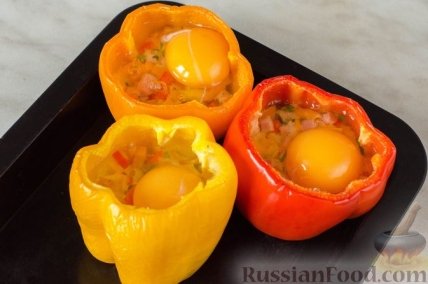 8 Достаем перцы и в каждый аккуратно разбиваем по одному яйцу. Снова отправляем перцы в духовку ещё примерно на 15-20 минут.
