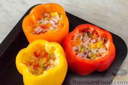 7 Заполняем перцы начинкой на 2/3 от всего объёма перцев. Укладываем их на противень и отправляем в духовку примерно на 20 минут.