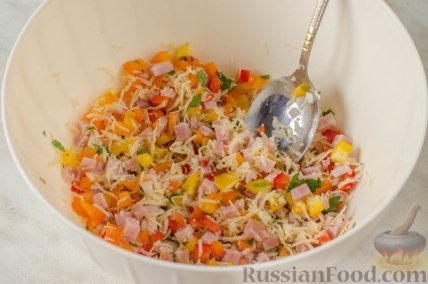 5 В миске соединяем измельчённые верхушки перцев, сыр, ветчину, лук и петрушку.