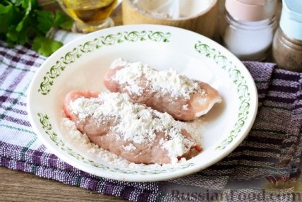 6 Муку высыпьте в подходящую ёмкость. Обваляйте рулетики в муке.