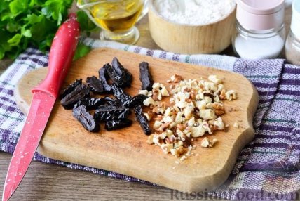 3 Чернослив нарежьте полосками. Орехи мелко порубите.