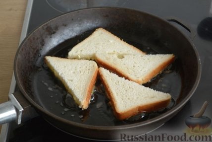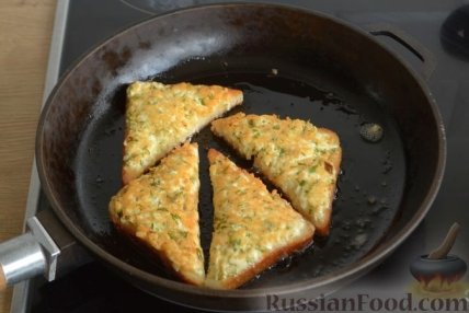 7 Переверните гренки на другую сторону и подрумяньте их ещё примерно 1 минуту. Начинка отлично держится на хлебе.