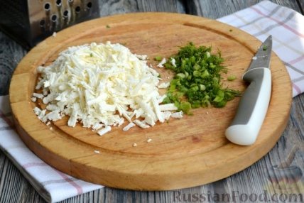 2 Приготовьте начинку. Брынзу натрите на крупной тёрке. Укроп и зелёный лук промойте, обсушите и мелко порубите ножом.