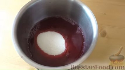 3 Жмых нам уже не нужен. Возвращаем сок на плиту. Добавляем в сотейник сахар, даём смеси закипеть и раствориться сахару.