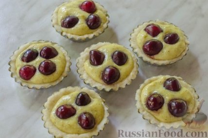 16 Достаем формочки с тестом из холодильника. Наполняем кремом. Сверху кладём по 3-4 черешни, слегка вдавливая их в крем. Отправляем в духовку на 25-30 минут.