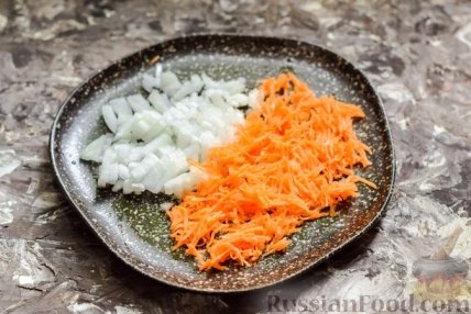6 Морковь натереть на мелкой тёрке, лук нарезать мелкими кубиками.