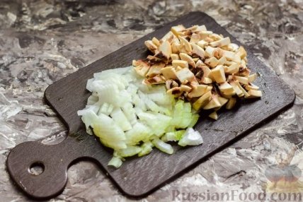 9 Приготовить начинку. Для этого лук и грибы нарезать мелкими кубиками.