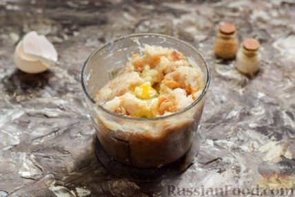 4 Переложить в чашу блендера рыбу, добавить яйцо. Батон отжать от молока и добавить к рыбе. Измельчить в однородный фарш в течение 2 минут.