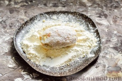 16 Сформировать котлету, соединяя края лепёшки так, чтобы начинка оказалась внутри. Обвалять котлету в муке. Аналогично сформировать зразы из оставшегося фарша и начинки.