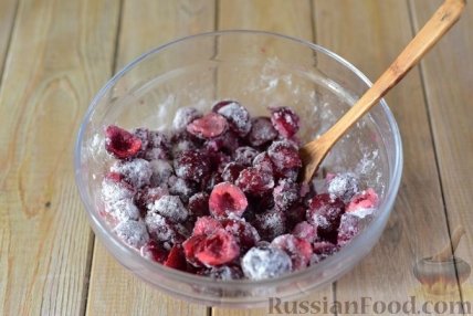 2 Вишни помоем и освободим от косточек и хвостиков, добавим в миску к сухой смеси. Перемешаем.