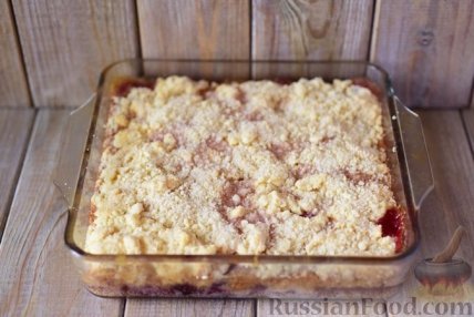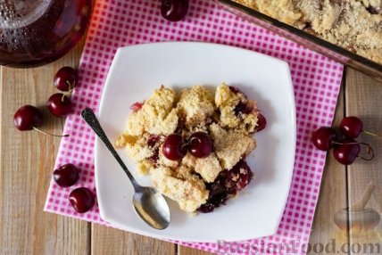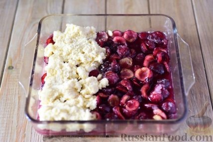 Очень много вишневой начинки укладывается прямо на дно формы и покрывается слоем крупной песочной крошки. Всё это запекается, и получается десерт с ярким ягодным вкусом с хрустящей