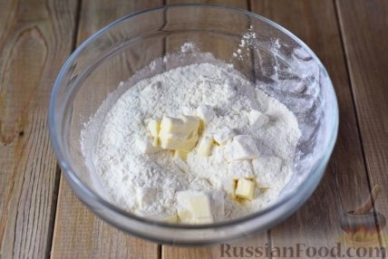 5 Холодное масло нарежем кубиками и добавим в мучную смесь.