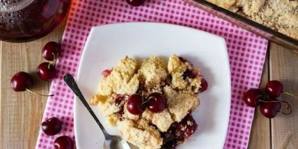 Очень много вишневой начинки укладывается прямо на дно формы и покрывается слоем крупной песочной крошки. Всё это запекается, и получается десерт с ярким ягодным вкусом с хрустящей