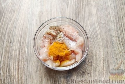 2 Курицу отправьте в миску, добавьте куркуму, соль, перец. Всё хорошо перемешайте, чтобы специи равномерно распределились по куриным кусочкам.