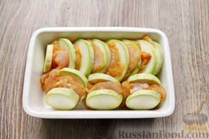 4 Форму для запекания смажьте растительным маслом. Выложите, чередуя, кабачки и курицу (начиная с кабачка и заканчивая им).