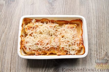 10 Сыр натрите на средней тёрке. Достаньте форму из духовки и посыпьте сверху готовые кабачки натёртым сыром.