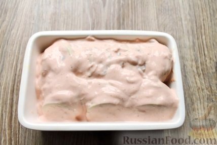 8 Залейте томатно-сметанной смесью кабачки с курицей.