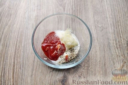 6 Чеснок очистите, измельчите и выложите к сметане и томатной пасте. Всё посолите и поперчите.