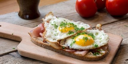 Поджарьте два яйца и слегка посолите. На хлеб сначала выложите ветчину или бекон, а сверху - яйца. Посыпьте рубленой зеленью.