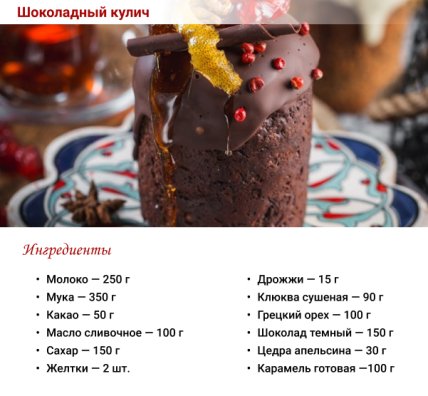 3. После того как куличи будут готовы, полить их сверху темным шоколадом, также можно украсить карамелью, цедрой апельсина, сушеной клюквой и грецким орехом.
