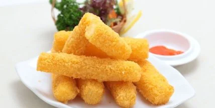 Палочки сервируем с зеленым салатом, томатами, оливками, зеленью. Сыр должен быть теплым.