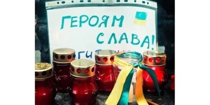 Собравшиеся возле украинской дипмиссии исполнили гимн Украины. Один из участников траурной акции держал в руках плакат с надписью на украинском языке: "Пробачте нас!". Кроме того, россияне скандировали лозунги: "Слава Украине!", "Герои не умирают!".
