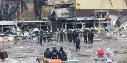 Отмечается, что спасателями расчищено от завалов более половины территории обрушенных конструкций ТЦ.